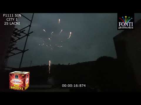 Descrizione: Il prodotto "SIN CITY 1" con il codice F1111 appartiene alla categoria F2 CE T.U.L.P.S.: V gruppo “C”. Si tratta di una batteria composta da 25 tubi di lancio. Le dimensioni dei tubi sono di Ø 20 mm, con una lunghezza complessiva di 130 mm, una larghezza di 130 mm e un'altezza di 125 mm.